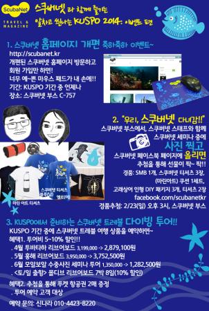 (주)스쿠버넷 트레블&매거진에서는 2014년 2월 20일부터 23일까지 COEX Hall C에서 열리는 수중스포츠전시회 KUSPO에 참가하여 다양한 이벤트와 세미나를 진행합니다. 이벤트1. 스쿠버넷 홈페이지 개편 축하축하 이벤트스쿠버넷 홈페이지에서 회원 가입을 하고 스쿠버넷 부스를 방문하여 회원 가입 인증을 해주시는 모든 분들께 더 버블에서 디자인한 예쁜 마우스 패드를...