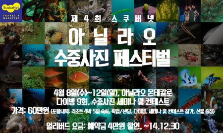수중사진을 가장 재미있고 신나게 배울 수 있는 기회!제4회 스쿠버넷 아닐라오 수중사진 페스티벌이 2015년 4월 8~12일 아닐라오 몬테칼로 리조트에서 열립니다. 알찬 세미나와 조별로 진행되는 다이빙&사진 디브리핑으로 사진실력을 한 단계 업그레이드 하세요~(펀다이빙 조는 별도로 편성합니다.)"이거 정말 다 주는 거야?"하고 놀라게 되는 참가자 전원에게 드리는 선물과 수중사진 컨...