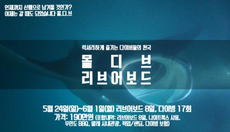 팔라우의 데이트립 다이빙은 매일 왕복 2시간을 스피드보트에서 보내야 합니다. 하지만 리버보드에서는 팔라우의 최고 포인트들을 거의 5분 이내 이동으로 다이빙하게 됩니다. 하지만 리버보드 일정을 맞추기가 쉽지 않아 한국에서는 가기가 쉽지 않습니다. 이런 어려움을 해결하고서, 스쿠버넷에서는 2014년 11월 27일~12월 5일 8박9일 일정의 팔라우스포츠 리버보드...