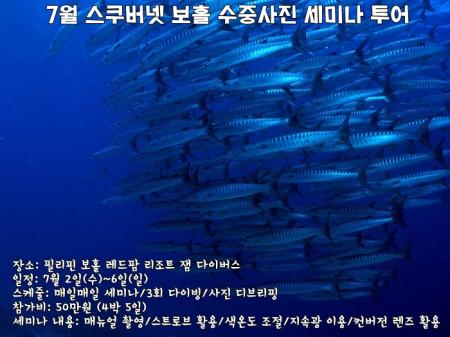 지난 4월의 스쿠버넷 아닐라오 수중사진 세미나 투어, 많이들 기억하시죠? 그 때보다 조금 적은 인원으로 조금 더 세밀하게, 보홀 수중사진 세미나 투어가 진행됩니다. 수중사진을 배우고 싶은 사람이면 누구나!!정상근 교수님과 함께 즐겁게 다이빙을 하면서 맞춤형 교육을 받을 수 있는 기회~수중사진에 대해 궁금했던 점들을 함께 풀어보며 실력을 한 단계 업드레이드 하세요! 행사...