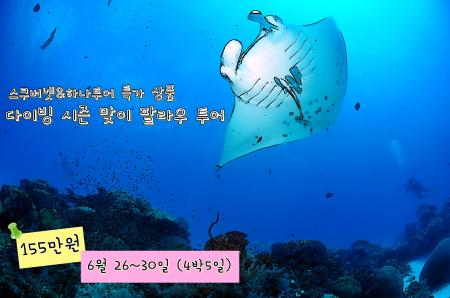 스쿠버넷과 하나투어에서 준비한 팔라우 다이빙 투어 특가 상품을 소개합니다^^ 기존 하나투어 팔라우 다이빙 상품은 젤리피쉬 레이크와 밀키웨이 관광료, 환경세, 마지막날 2회 다이빙비용이 별도로, 추가 요금으로 부과됩니다.하지만 스쿠버넷에서는 다이버들을 위하여 모두 포함 시킨 상품을 소개합니다.[일정] 1일차 인천 출발 [OZ0609-2...