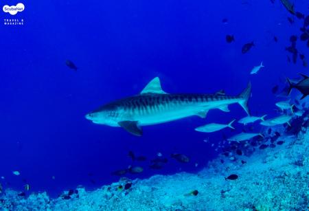 해양생물: 상어의 식별 뱀상어 Tiger Shark 뱀상어는 영어로는 타이거 상어 Tiger Shark이며, 학명은 Galeocerado cuvier이다. 몸에 나타나는 검은 줄무늬가 호랑이를 닮았다고 해서 영어로는 타이거 상어이다. 머리가 몸통에 비해 약간 커서 위에서 보면 꼭 뱀의 머리 같아 보이기에 뱀상어라는 이름이 붙었다는 이야기도 있다. 우리나라에서는 다르게 배암상어, 범상어, 호랑이상어 등으로 부르기도 한다.몰디브 푸바물라에서 만...