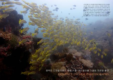 콤택트 디지털카메라 촬영 기술자연광 촬영 수중사진을 촬영하다보면 간단하지만 아주 중요한 사실을 잊어버리는 경우가 많이 있습니다. 대부분의 경우, 입수한 후에 멋진 피사체를 찾아 깊은 수심으로 쭉 내려갑니다. 다이빙을 마치고 상승할 때는 블루워터에서 안전정지를 하고 수면으로 올라옵니다. 촬영을 할 때도 처음 스트로브를 켠 상태에서 끝까지 촬영을 하곤 합니다. 수면에서 10미터 이내의 수심은 하강하고...