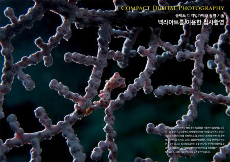 Compact Digital Photography콤팩트 디지털카메라 촬영 기술백라이트를 이용한 접사촬영작은 씨팬에 자리잡고 있는 피그미해마의 뒤에 스트로브를 소형 트라이포드로 설치하고 광센서에 반사키트를 이용하여 동조시켜 촬영한 사진. 카메라와 연결될 숙주 스트로브는 약하게 하고 방향도 틀어서 조광하였다. Anilao, Philippines. Canon S100, Patima housing, Inon micro conversion lens UCL1...
