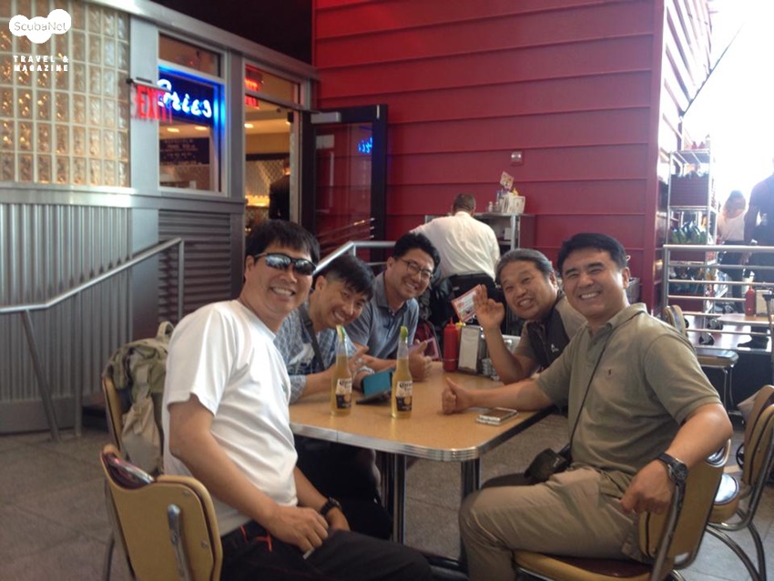 갈라파고스 투어 참가자들과 뉴욕에서. 제일 왼쪽의 필자가 다이브데모 솔리스를 착용하고 있다.