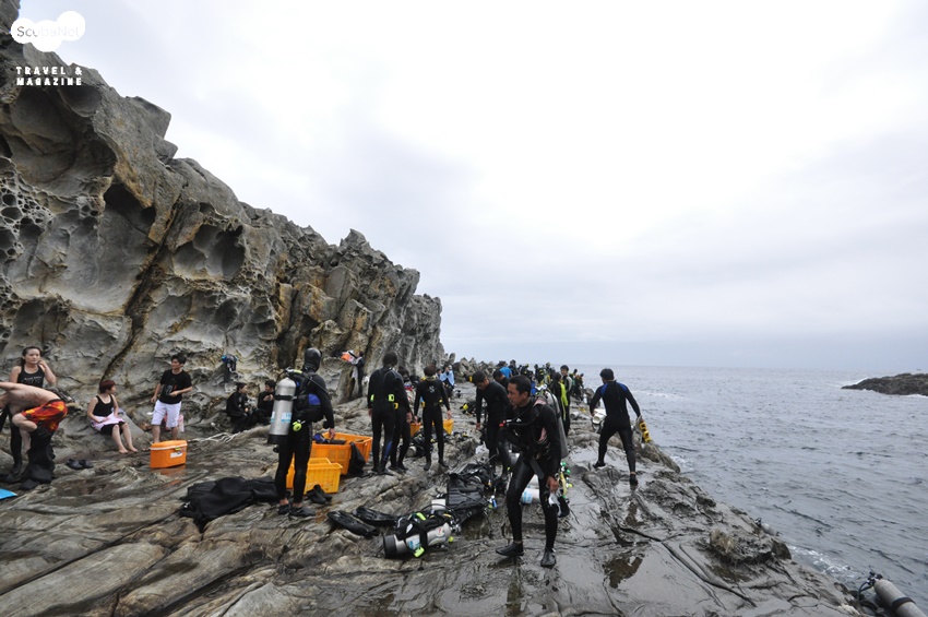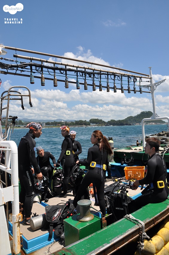 낚시어선을 이용하여 문섬 새끼섬으로 나와 섬 다이빙을 준비하는 다이버들