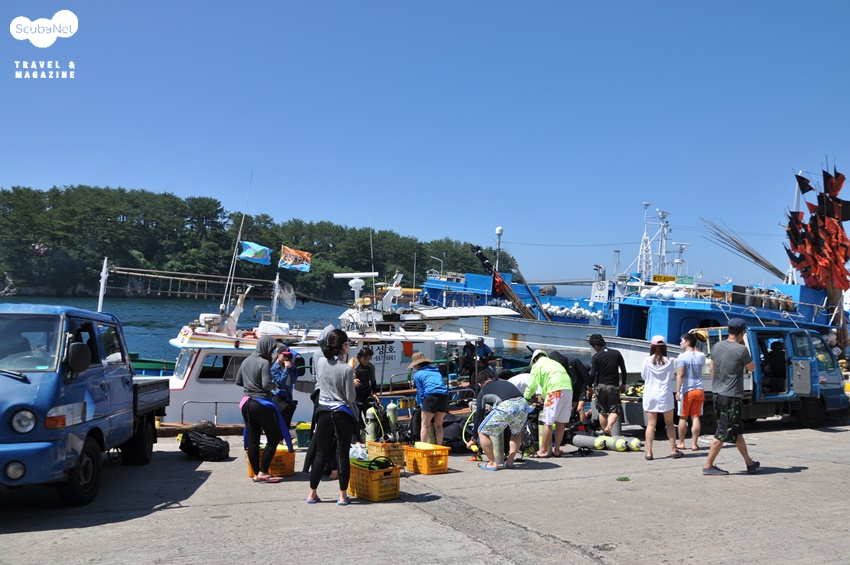 서귀포항에서 낚시어선을 이용하여 문섬으로 나가려는 다이버들