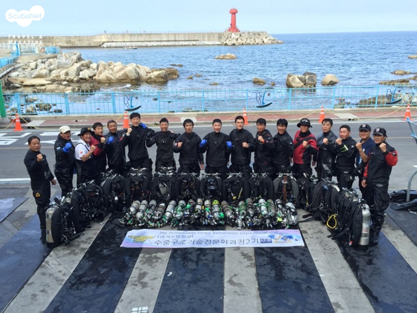강원도 양양의 남애 스쿠버 리조트(대표 김정환)에서는 지난 7월 20일~25일 경기소방학교의 수중구조기술전문화 과정 2기 교육이 진행되었다. 이 교육은 PSAI 코리아 본부(본부장 성낙훈)에서 진행한 것으로 성낙훈 본부장과 김동윤, 이규길, 김정환 트레이너와 김재경 강사가 스태프로 참가하였고, 경기도 관내 소방구조대원들 중에서 지원하여 사전 테스트를 통과한 10명의 교육생들이 교육을 받았다. 남애 스쿠버 리조트에서는 테크니컬 다이빙을 지원할 수 있는 시스템이 갖춰져 있어서 전체 교육 중 수영장 교육이 포함된 전반기 교육을 울진해양레포츠센터에서 마친 다음에 후반기 교육인 해양실습 과정이 남애 스쿠버 리조트에서 진행되었다. 이번 교육과정 중 한번을 함께 다이빙하면서 참가자들의 수중 단체 사진도 촬영하였고, 남애 스쿠버의 다이빙 포인트인 엉터리 어초도 구경할 수 있었다.