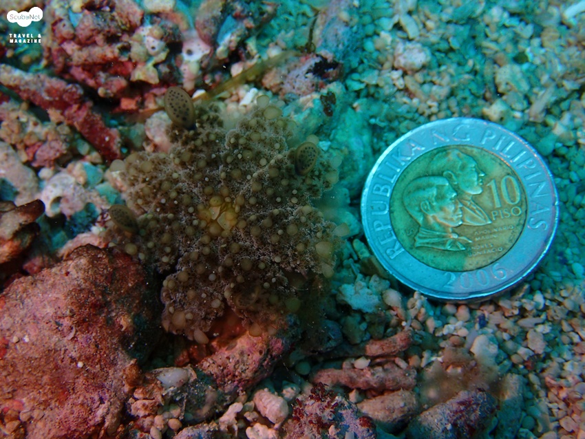 필리핀 10페소 동전으로 비교한 Upside-down Jellyfish의 크기그리고 혹 보라카이에서 이 Upside-down Jellyfish를 발견해서 자세히 관찰하다 보면 아주 조그만 Carrier crab을 발견할 수도 있습니다. 보통은 해파리의 아래쪽에 붙어 있는 경우가 많지만 간혹 해파리의 촉수 위로 올라와 있는 경우도 있습니다. 혹 관찰하다가 신기해서 해파리를 만지려고 하면 해파리에게 쏘일 수 있으니 조심하시기 바랍니다. 다른 해파리보다는 약하긴 하지만 독을 가지고 있다고 하니 눈으로만 봐주세요~