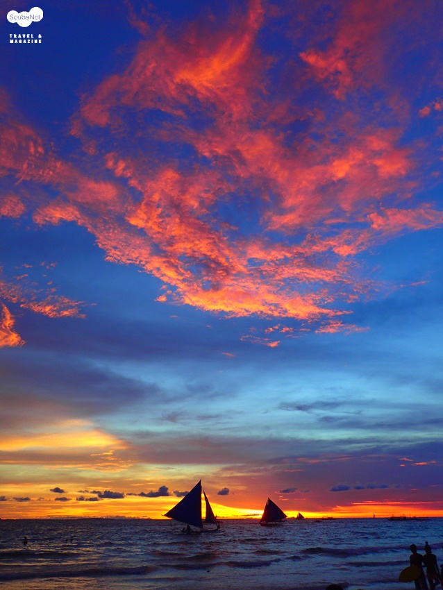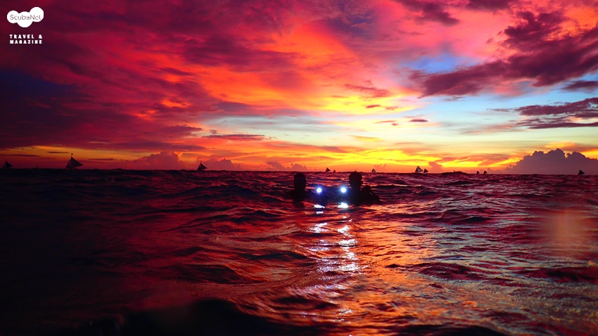 우기에 만난 뜻밖의 멋진 석양을 뒤로 하고 야간 다이빙 입수를 준비하는 다이버들보라카이의 경우 우기에만 부는 계절풍-HABAGAT의 영향으로 다이빙은 앞바다 WHITE BEACH에서 진행되는 날이 적으며, 주로 뒷바다 BULABOG에서 진행됩니다. 우기 시즌 5개월, 150여일동안 앞바다에서 30일에서 40일정도 다이빙이 진행되고 나머지는 뒷바다에서 진행된다고 생각하시면 될 듯 합니다. 우기라고 해서 무조건 뒷바다라는 공식이 성립하는 건 아니고 HABAGAT이 약해지고 파도가 잔잔한 날이면 앞바다에서 다이빙을 진행하게 됩니다. 다이버들이 보라카이를 방문한 시점에 따라서 앞바다와 뒷바다 둘 다 경험할 수 있는 경우도 있습니다. 그 날의 날씨에 따라서 앞바다 혹은 뒷바다에서 다이빙이 진행될지 결정되기 때문에 보라카이 전체를 경험할 수 있는 것이 우기의 장점이 되겠네요.