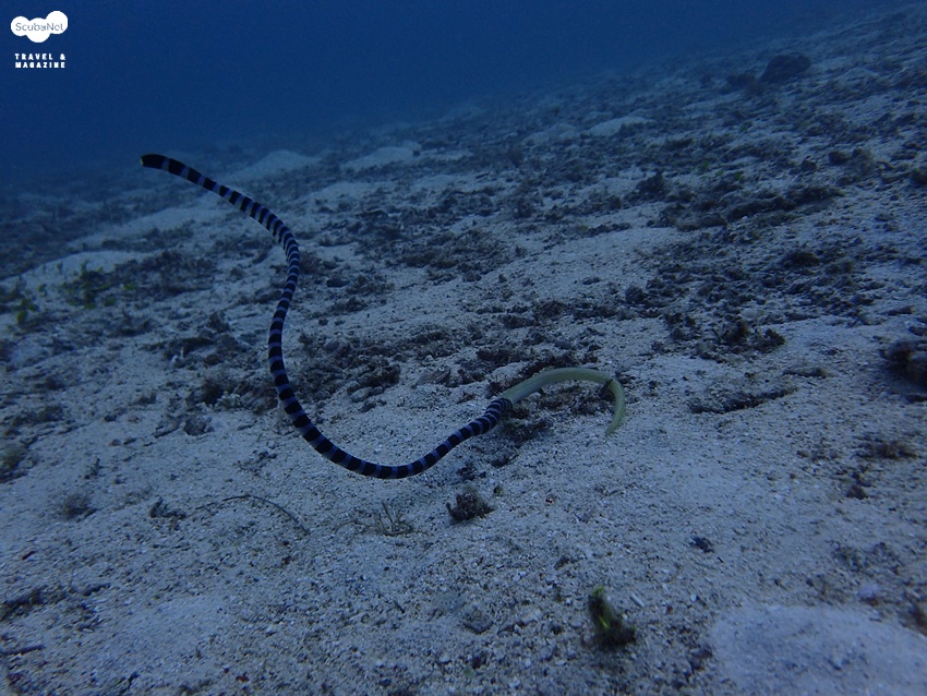 바다뱀의 사냥장면을 목격한 건 작년 8월이었습니다. 뒷바다 마크로 포인트인 TULUBHAN 포인트에서 목격했고요. 멀리서 요란하게 움직이는 생물이 보여서 가까이 가보니 바다뱀이 “EEL”이라고 추정되는 생물을 삼키고 있었습니다. 삼키는 시간은 대략 5분 정도 계속 되었으며 5분만에 자신과 거의 동일한 크기의 생물을 다 삼켜버렸습니다. 이렇게 삼키고선 급하게 수면으로 올라가는 모습을 연출했습니다. 먹이가 된 EEL은 바다뱀보다 길이나 크기가 동일한 크기로 예상되었는데요. 자신만한 생물을 단 5분만에 다 삼켜버리고선 그 자리를 떠나는 바다뱀을 보고선 다소 충격을 받았던 기억이 납니다.