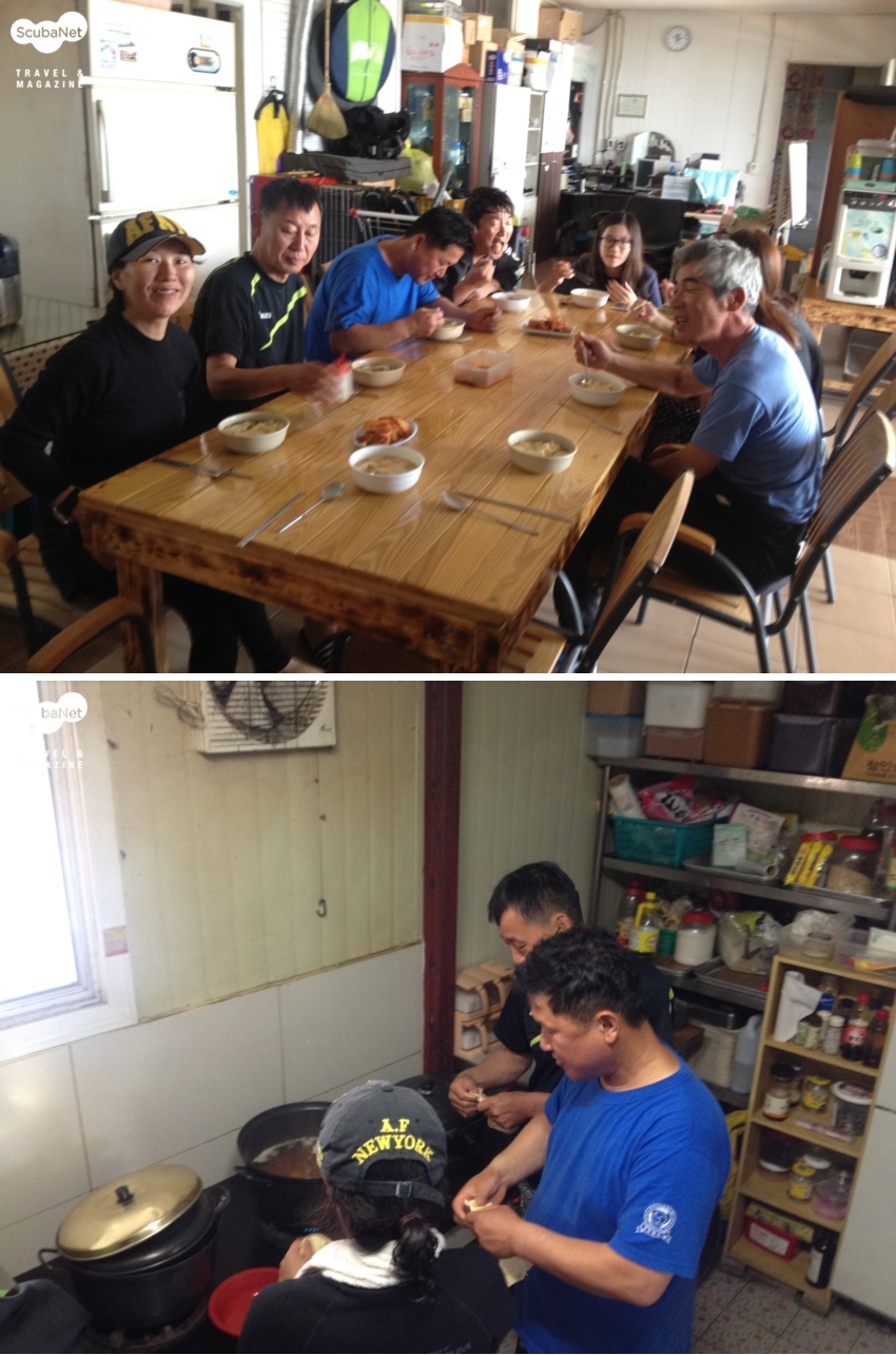 해원 다이브 리조트는 다이버들과 함께 밥을 지어먹는데 박상용 대표가 주문진에서 나는 싱싱한 해산물들을 구해서 탕이나 조림을 하기도 하고, 입맛에 따라 국수나 수제비 등의 별식을 만들어 먹기도 한다. 아침은 시원한 콩나물북어국으로 속을 풀어주었고, 점심에는 박상용 대표와 박현정 CD 등 다이버들이 함께 수제비를 떠서 먹었다. 그만큼 가족 같은 분위기로 다이버들을 대하기 때문에 해원리조트에는 평일에도 한두 명의 다이버들은 꼭 만날 수 있다.