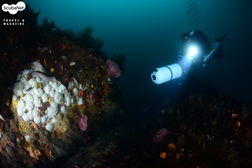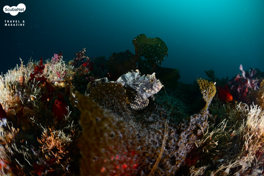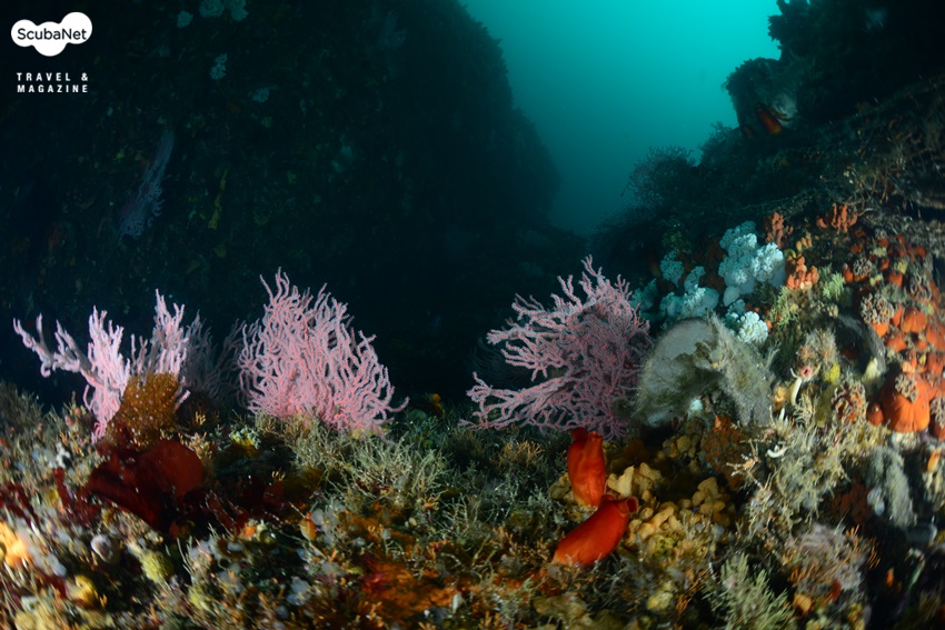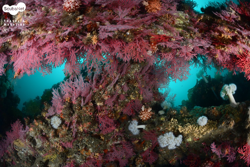부채뿔산호와 비단멍게, 말미잘들이 보이는 계곡