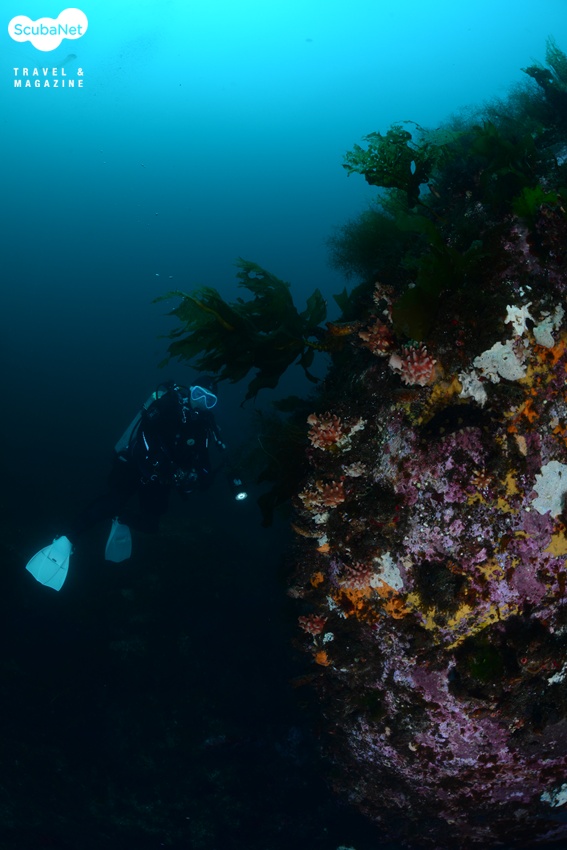 암반의 부착생물들을 관찰하는 다이버(사천)