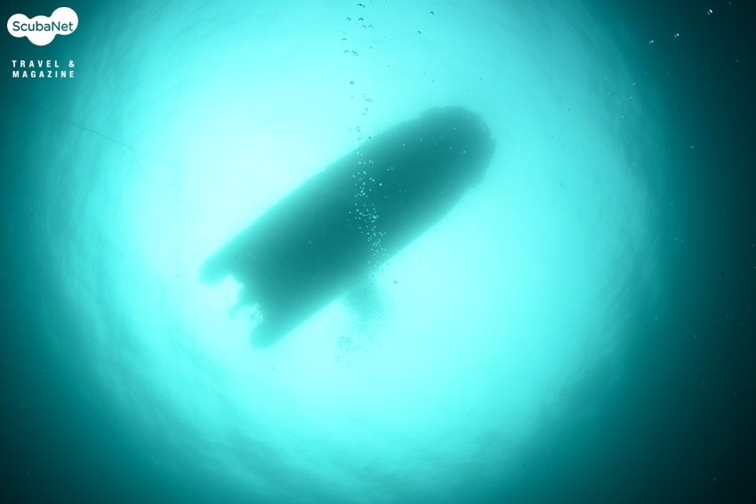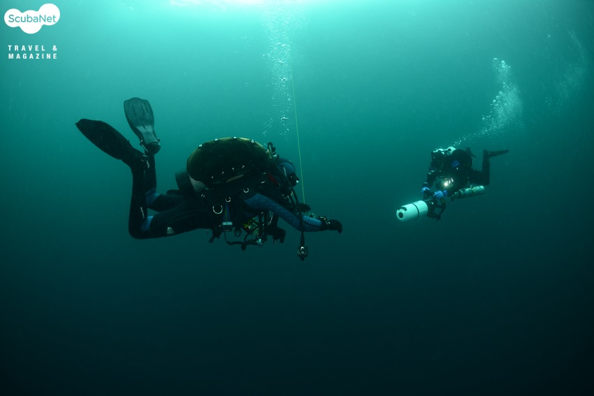 처음 들어가 본 딥다이빙 포인트오현석 대표는 더블탱크를 착용했고, 함께 다이빙한 다이버들은 싱글탱크를 착용했다. 그리고 필자는 추가로 데코 탱크를 휴대했다. 드라이슈트를 착용하고 들어가는 딥 다이빙에서 싱글탱크 하나로 다이빙하는 것은 기체량에서 부담이 되었을 뿐 아니라 혹시라도 촬영을 하다 보면 감압에 걸릴 수도 있으므로 50% 나이트록스로 감압시간의 부담을 줄이려는 것이었다.