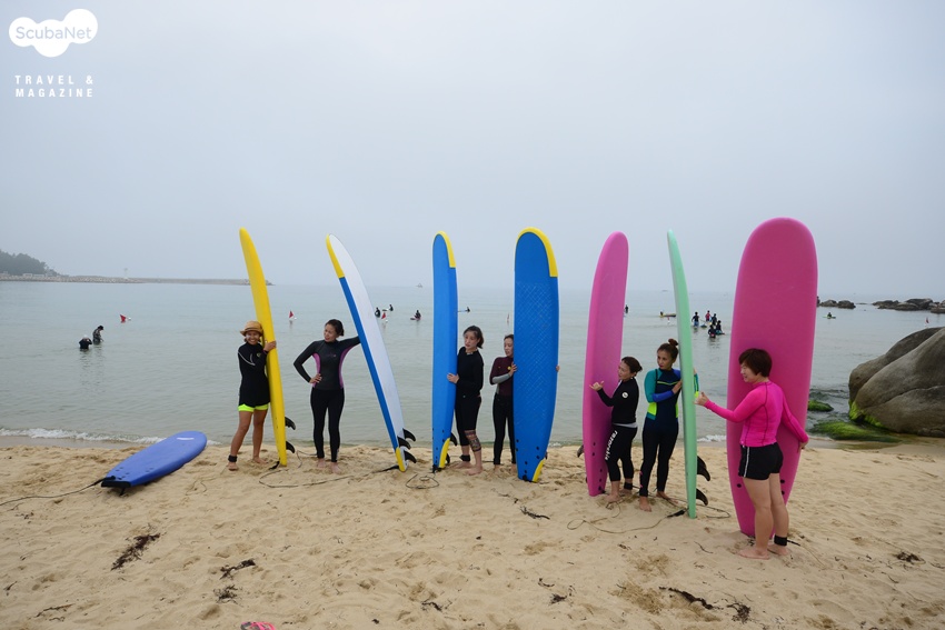 서핑 강습을 받기 위해 죽도 해변에 모여있는 사람들