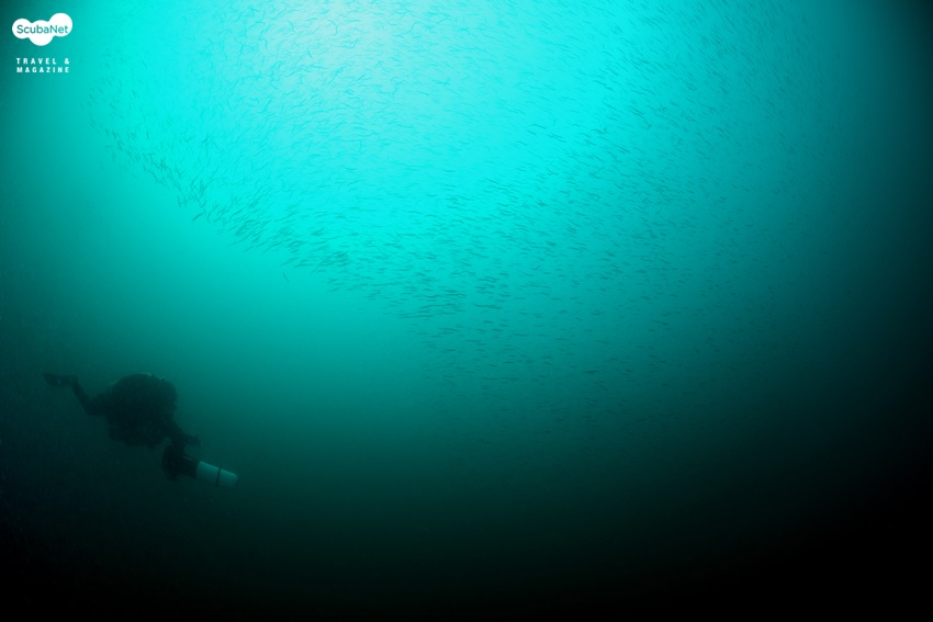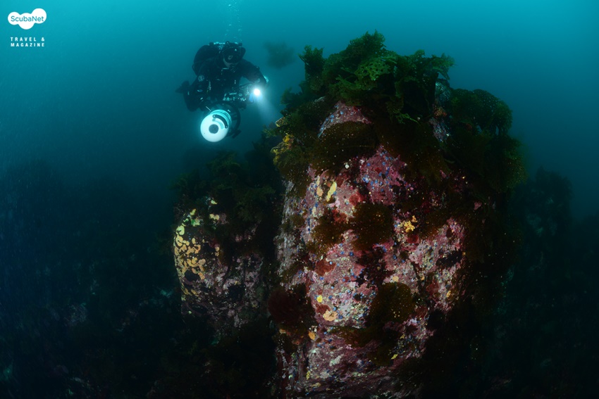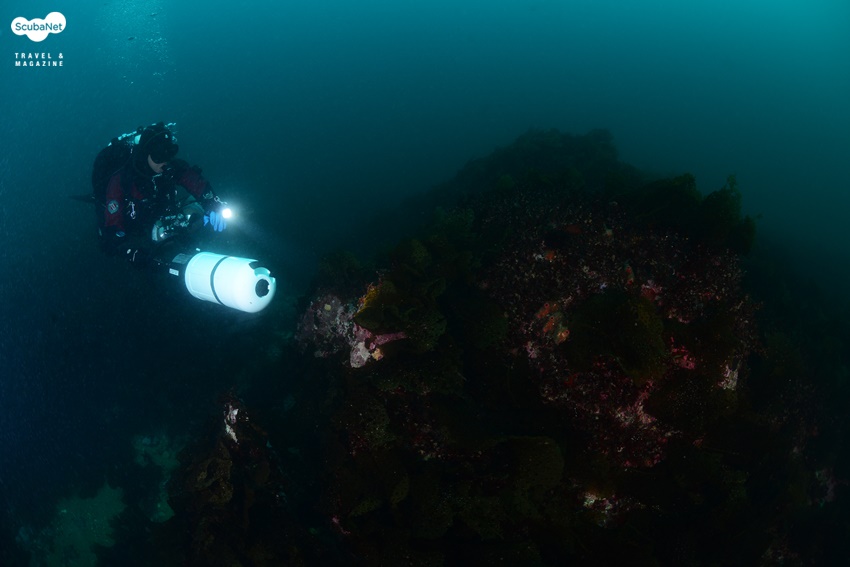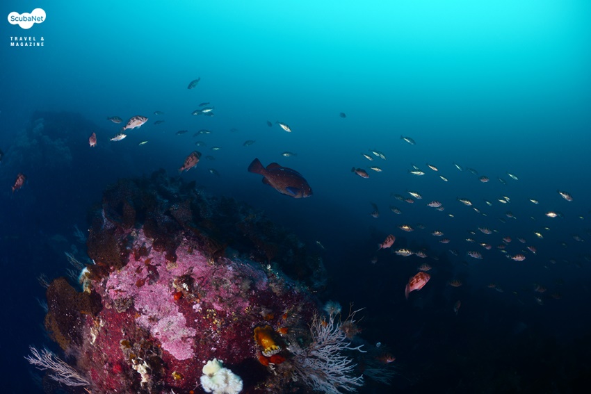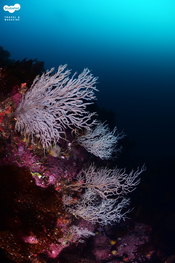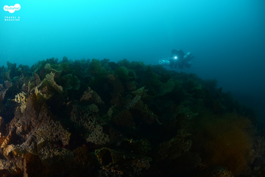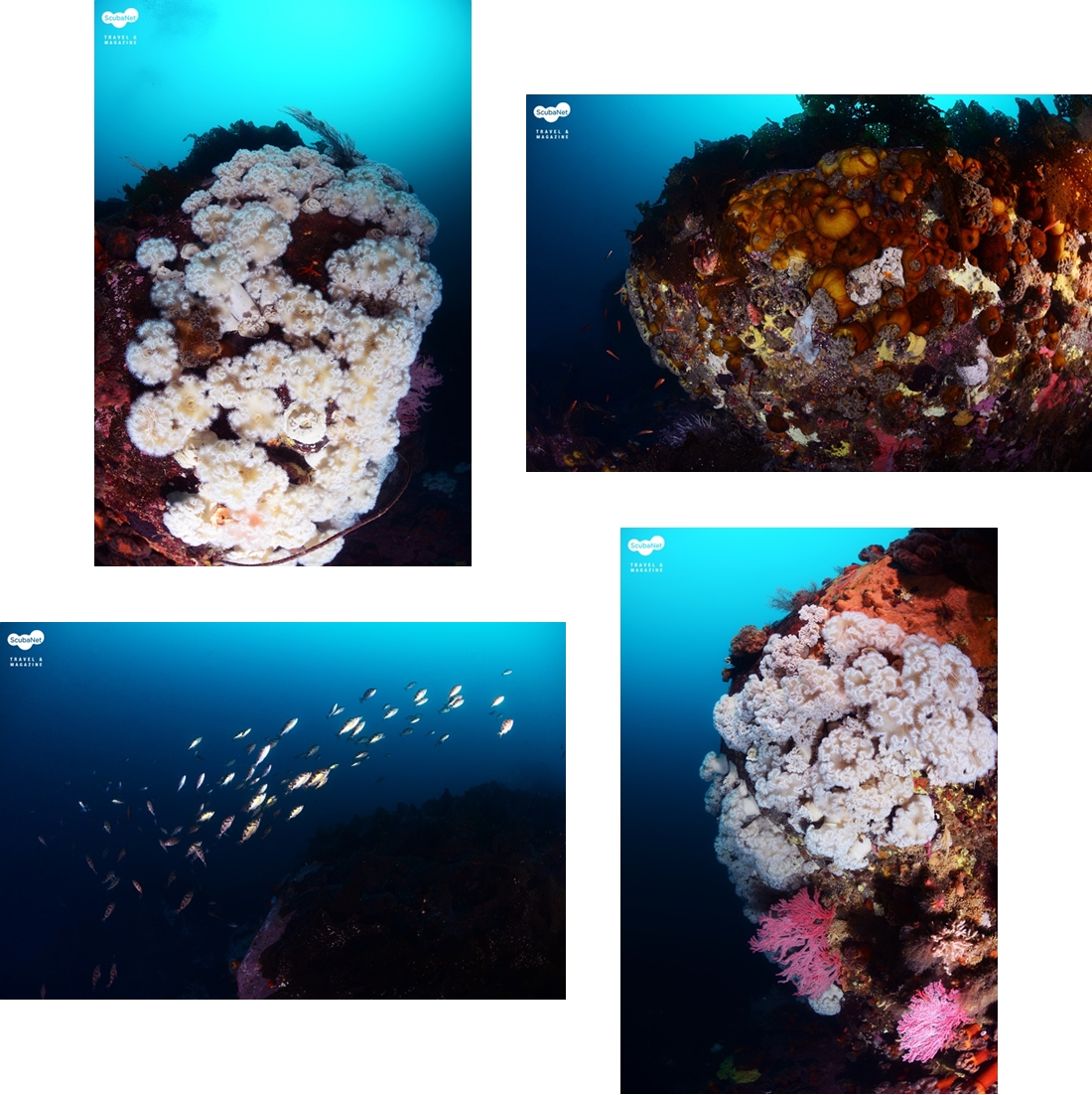 조류에 하강라인이 옆으로 비스듬하게 누워있었고, 봉우리가 아닌 38m 모래 바닥에 웨이트가 내려져 있었다. 부이가 수면으로 노출될 것을 기대하면서 웨이트를 들고 봉우리의 가장 높은 곳으로 옮겨 놓았다. 나머지 다이버들이 이를 보고 포인트를 찾아오길 기대하면서 말이다. 29m 봉우리 근처의 벽으로는 흰색과 갈색의 섬유세닐말미잘들이 군락을 이루고 있었다. 하지만 수온이 상승한 상태라 일부만 촉수를 펼치고 있을 뿐 대부분의 말미잘들이 모두 수축해 있었다.