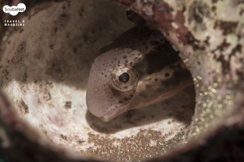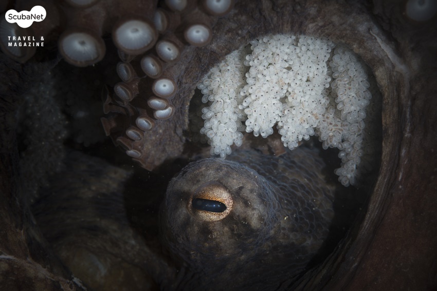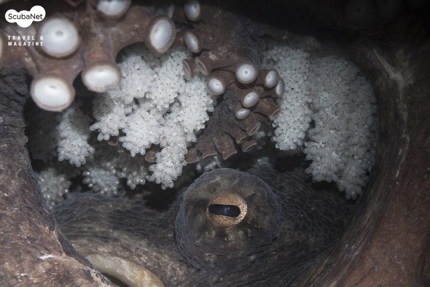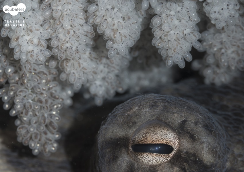 특히 바위 틈 사이에 산란하고 알을 지키고있는 문어와 말미잘 아래 바위에 산란한 흰동가리돔, 소라껍질 속에 산란한 베도라치, 입안 득히 알을 물고 있는줄도화돔의 포란을 관찰할 수 있었다