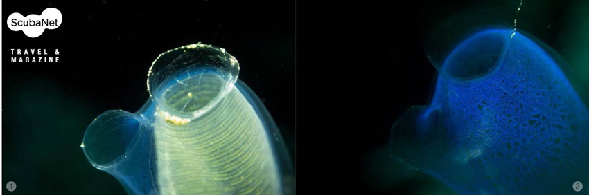 지속광을 앞뒤에서 주고 촬영한 유령멍게로 빛의 방향에 따라 멍게의 무늬가 달리 보인다.