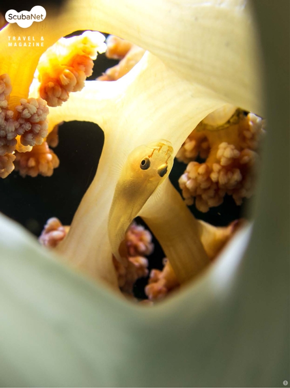 연산호 폴립 아래 공간에서 편하게 쉬는 고비를 지속광을 이용하여 백라이트로 조광하여 촬영한 사진. 반투명한 연산호를 투과하여