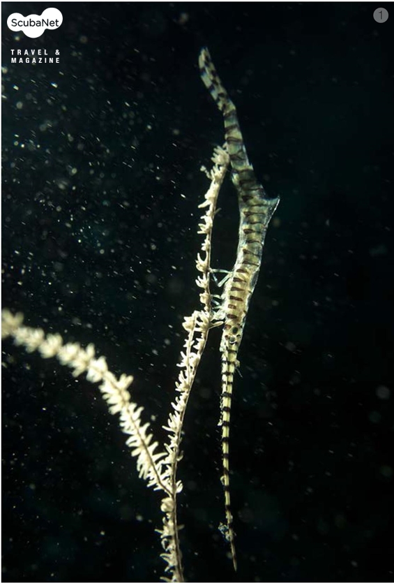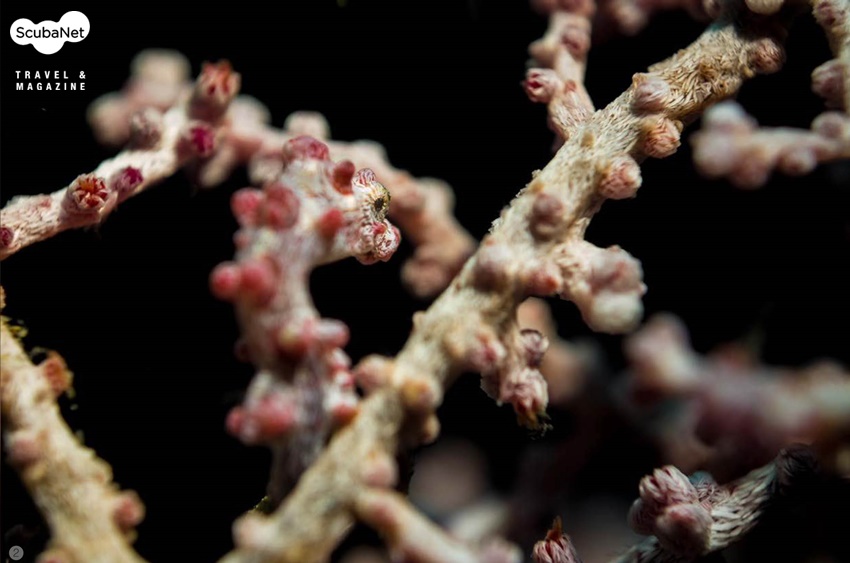 씨팬에 자리잡고 있는 피그미해마Pygmy seahorse를 지속광으로 촬영한 사진.