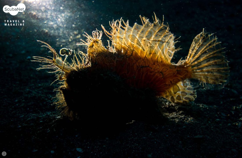 털씸뱅이Hiary flogfish를 촬영하면서 털을 강조하기 위하여 지속광을 이용하여 후면에서 라이팅을 하였다. 펼진 등지느러미와 털은 빛이 투과되어 밝게 표현되었으며, 머리부분은 빛이 투과되지 않아 실루엣으로 나왔다.