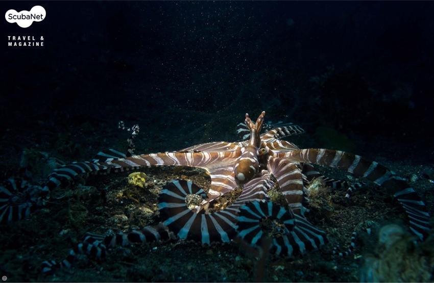 모래 위를 유영하는 미믹 문어Mimic octopus를 지속광을 위에서 비추고 촬영한 사진. 랜턴이 비춰지는 상태를 확인하면서 노출을 문어 머리에 맞춰 촬영하였다.