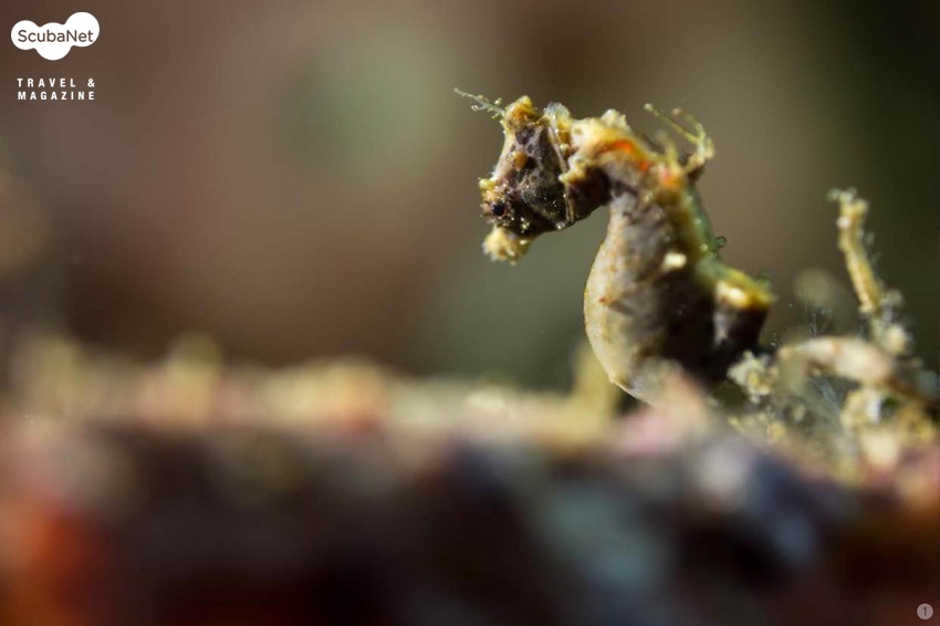 얕은 수심의 바위 위에서 써지에 따라 흔들리는 폰토히 피그미해마Pontohi pygmy seahorse를 지속광을 이용하여 촬영한 사진. 사진의 왼쪽에 직진형 랜턴을 두고, 자연광과의 밸런스를 맞춰 노출을 조절하여 촬영하여 배경을 살렸다.