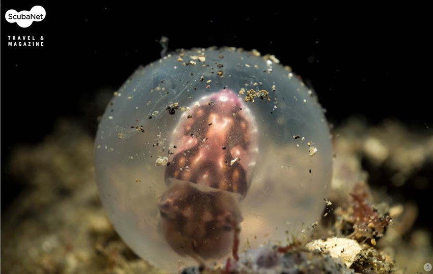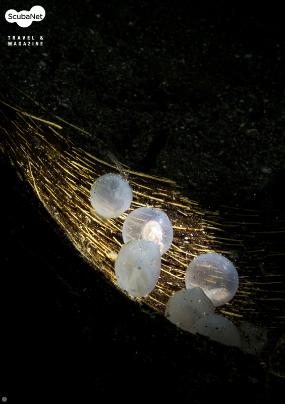 프램보연트 커틀피시Flanboyant cuttlefish의 알을 지속광을 이용하여 촬영한 사진. 하나의 직진형 랜턴을 위에서 알을 비추고 안쪽의 프램보연트 커틀피시 유어를 촬영하였다.