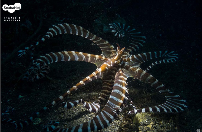 모래 위를 유영하는 미믹 문어Mimic octopus를 지속광을 위에서 비추고 촬영한 사진. 랜턴이 비춰지는 공간의 부유물이 자잔하게 나타나는 것이 빛의 방향을 보여준다.