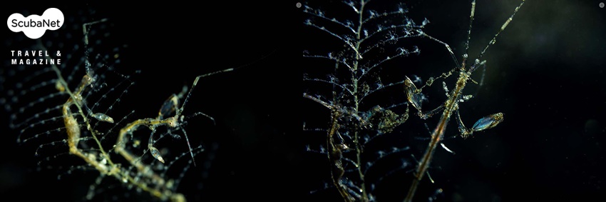 Skeleton shrimp를 촬영할 때, 뒤쪽 바닥에 랜턴을 놓고 촬영하면 효과적입니다. 투명한 새우의 윤곽이 뚜렷히 살아나며 검은 배경 위에 밝은 실루엣이 멋지게 표현됩니다. 불투명한 피사체는 백라이트를 보조광으로 사용하고, 앞쪽에서 주광을 하나 더 사용하는 것이 좋습니다. 털이 많은 피사체도 이 방법이 효과적입니다. 헤어리쉬림프Hairy shrimp를 촬영할 때도 백라이팅을 같이 사용하면 디테일이 확실하게 살아나 좋은 사진을 촬영할 수 있습니다.