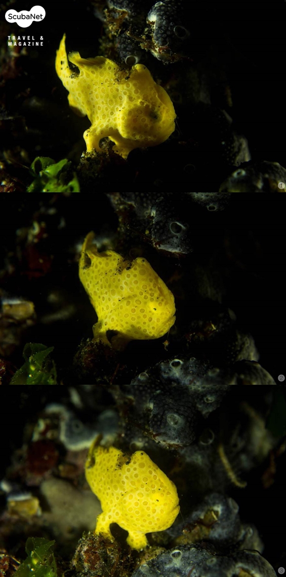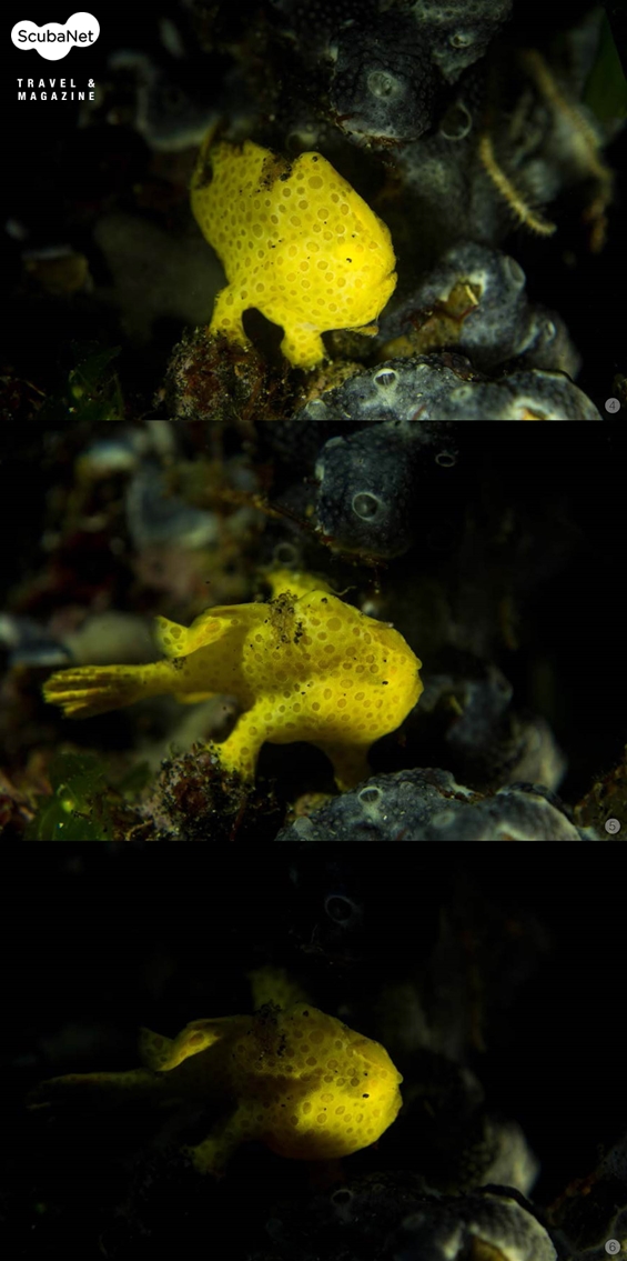 노랑씸뱅이Yellow flogfish를 두개의 지속광을 이용하여 조명을 바꿔가며 촬영한 사진. 보조광을 오른쪽에 세팅하고, 주광을 피사체의 왼쪽에서 조광하기 시작하여 서서히 정면을 거쳐 오른쪽으로 옮겨가며 촬영하였다. 지속광의 조사방향에 따라 다양한 분위기의 씸뱅이를 촬영할 수 있다. Lembeh, Indonesia. Sony RX100, Patima housing, IArchon W16S+Patima PL1300 Lantern, Inon UCL-165M67 macro conversionlens, M mode, AWB, f10, 1/200s, ISO1002. 지속광에 노출을 맞춘다자연광을 무시하고 지속광의 밝기에 맞는 노출을 설정하는 방법입니다. 랜턴을 비춘 상태에서 피사체가 적정노출이 되도록 조리개, 셔터스피드, ISO를 LCD창을 보면서 설정합니다. 배경을 검게 처리하는 경우가 대부분이며, 랜턴 빛을 받은 부분만 밝게 나타나게 됩니다. 자동노출을 이용하면 직접 랜턴 빛을 받는피사체가 대부분 노출과다가 되기 때문에, 매뉴얼 모드를 사용하는 것이 좋습니다.