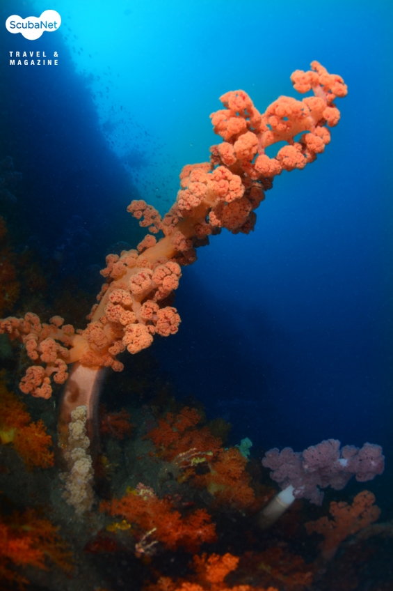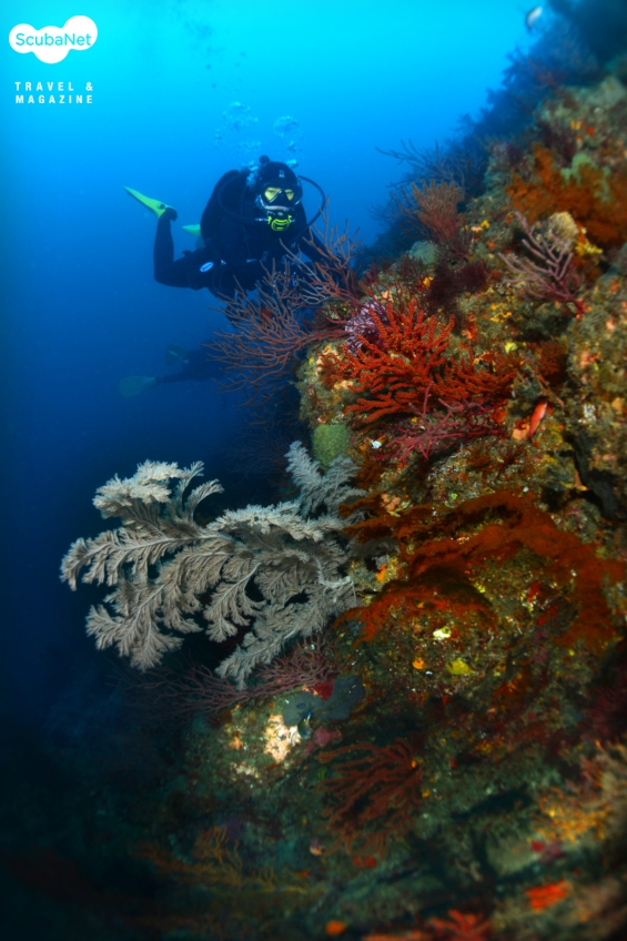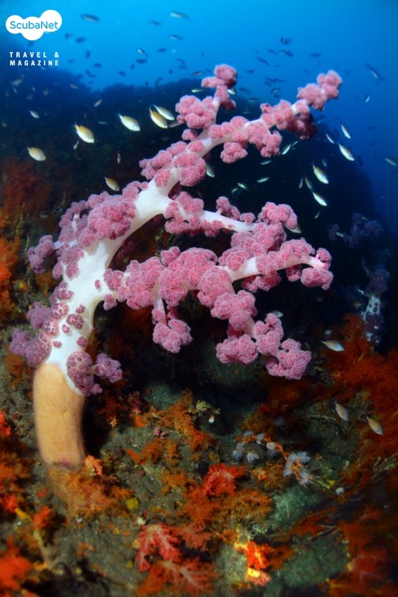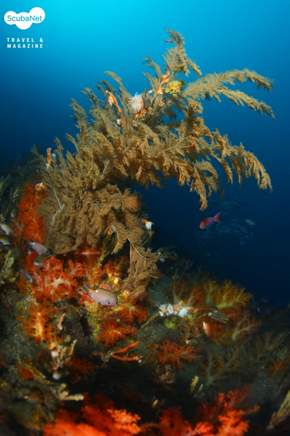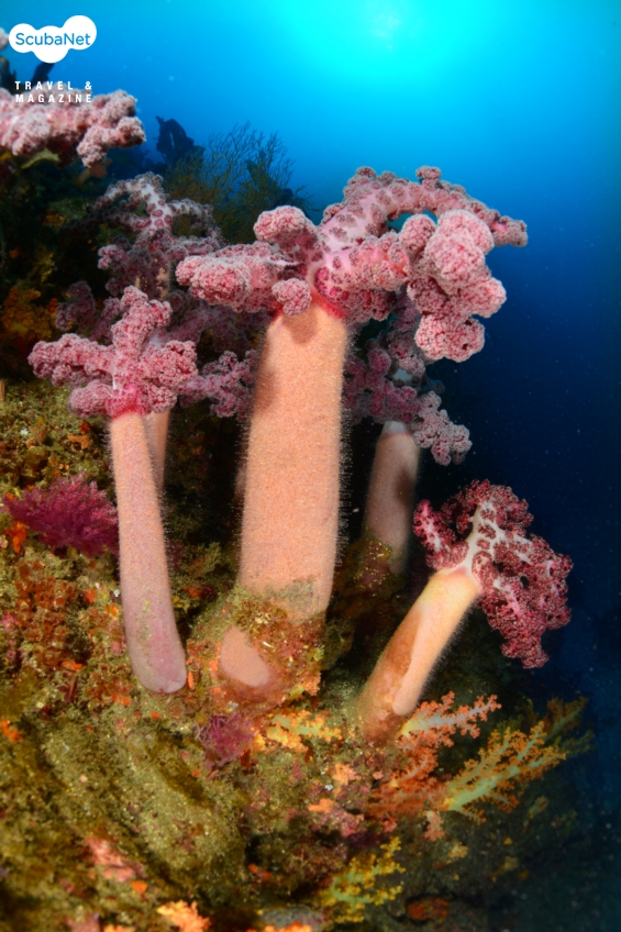 한개창 절벽에 자리잡은 가시수지맨드라미입수와 함께 눈앞에 펼쳐지는 주황색 연산호 군락은 마치 환영의 세레모니라도 하듯 가볍게 흔들리고 있었고, 20m쯤에서 점차 만나게 되는 수지맨드라미들이 각자의 색상을 뽐내며 자리를 잡고 있는 모습이 멀리서도 반갑게 눈에 들어온다. 40 m 즈음은 세찬 조류에 흩날리는 부유물들로 어두웠지만 수지맨드라미를 에워싸듯휘감아 펼쳐진 담홍말미잘의 자태가 묘한 느낌을 주기도 했다.
