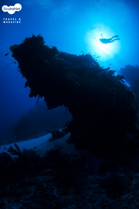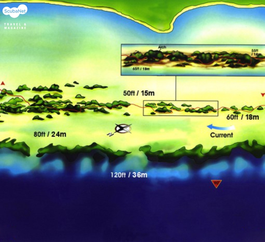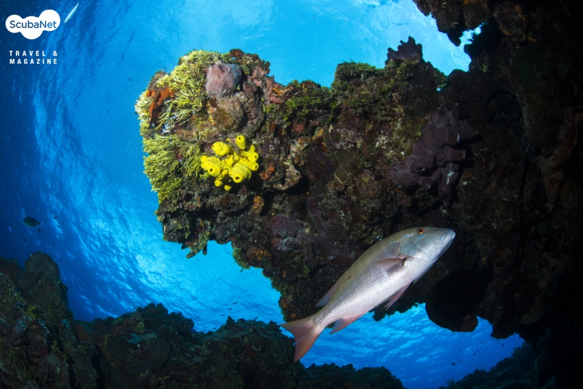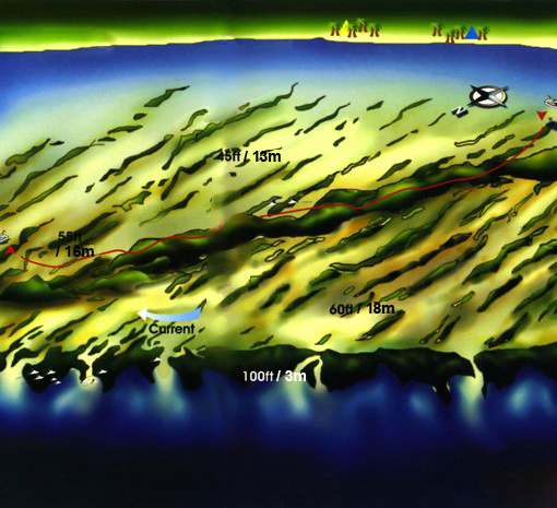 줄지어 늘어선 바위 지형 위로 조류를 타고 유영을 하면, 우주선을 타고 하늘을 나르는 것 같은 기분이 든다. 아래에는 깊은 계곡이 이어지고, 왼쪽에는 바닥이 보이지 않는 검은 심연이 흐르고, 오른쪽에는 하얀 모래사장이 넓게 펼쳐져 있다. 봉우리에 발달된 다양한 해면과 부채산호가 나를 찍어달라고 유혹한다.