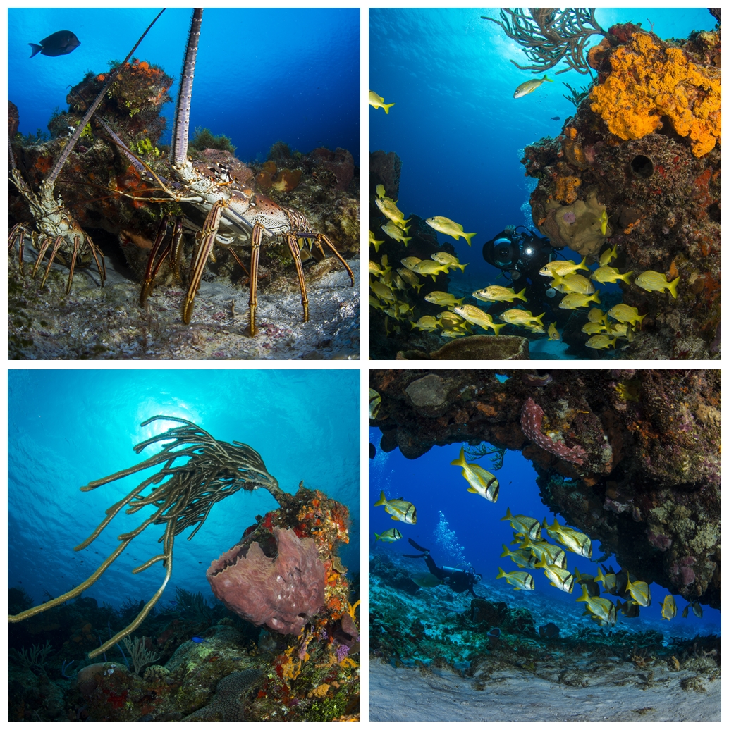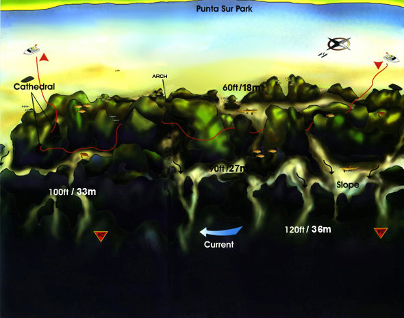 조류에 몸을 피하느라 다이버가 접근하여도 잘 도망가지 않는다. 선형으로 발달되어 있는 산호초에는 주황색 해면이 잘 발달되어 있으며, 베이지 색 부채산호들 사이에 코주멜에서 쉽게 볼 수 있는 커다란 그레이 엔젤피시Gray Angelfish가 짝을 지여 노닐고 있다. 코주멜에서는 대형 트리거피시Triggerfish도 짝을 지어 다닌다. 가끔씩 회색의 큼직한 너스샤크Nurse Shark이 우아한 꼬리짓을 하며 지나가며, 암초 아래에 숨어 쉬고 있는 모습도 발견할 수 있다. 오목한 바위 안쪽에는 노란 스내퍼Snapper 무리가 조류를 피해 모여 있다.