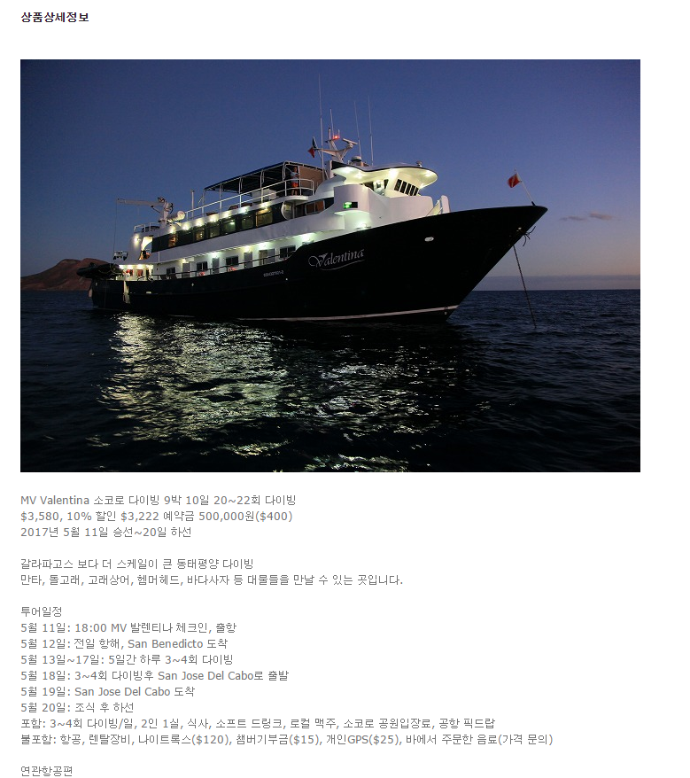 자세한 내용은 스쿠버넷의 여행전문 쇼핑몰 스쿠버트레블(http://scubatravel.kr)을 방문해서 직접 확인하시고, 구체적인 문의는 02-554-2402로 해주시기 바랍니다. ^^