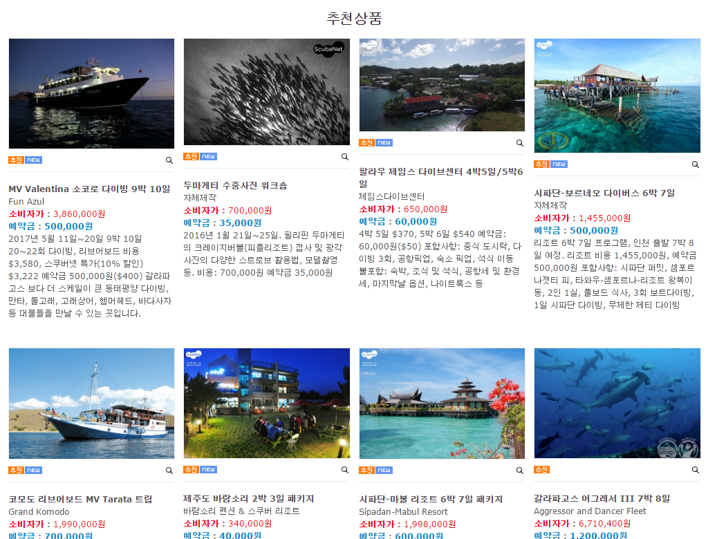 스쿠버넷의 그간 경험을 바탕으로 잘 검증된 여행상품들을 선택적으로 소개하고 있는데 리브어보드 보트, 리조트 등 해외의 유수한 업체들과 한국인이 운영하는 해외 리조트, 국내 리조트 등도 함께 소개하고 있습니다. 이러한 업체들의 여행 프로그램들은 스쿠버넷에서 예약을 대행하고 있으며, 예약금은 쇼핑몰 내에서 카드나, 무통장 입금 등으로 바로 예약 가능합니다. 회원들이 카드결제 등으로 예약을 하면 스쿠버넷에서 출발일과 사용가능한 룸 등을 확인한 후에 확약을 드립니다. 추후 잔금은 리브어보드 트립, 해외 리조트 등에 따라 지정된 일자에 송금을 하게 되고, 회원 등록 정보 등을 전송해주면 됩니다.