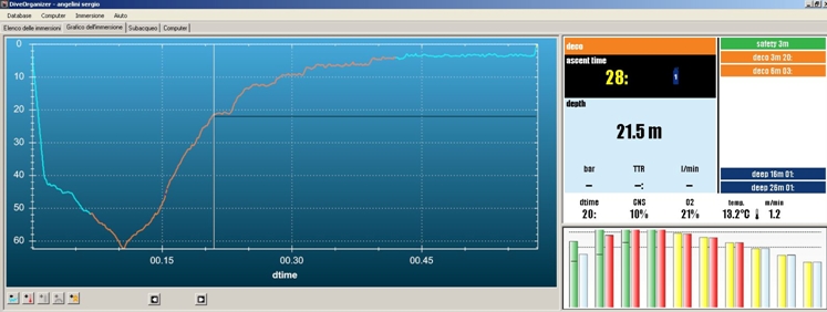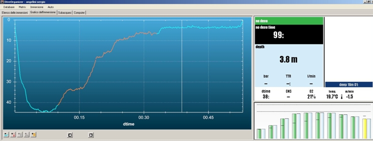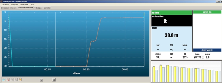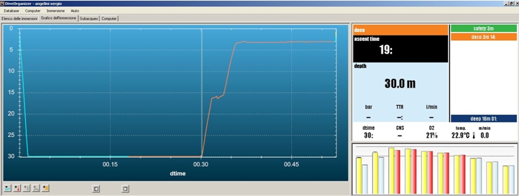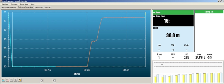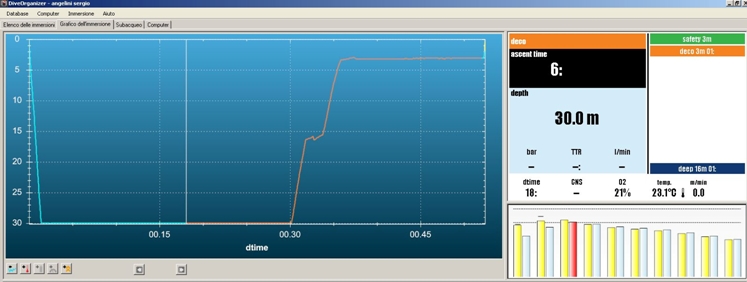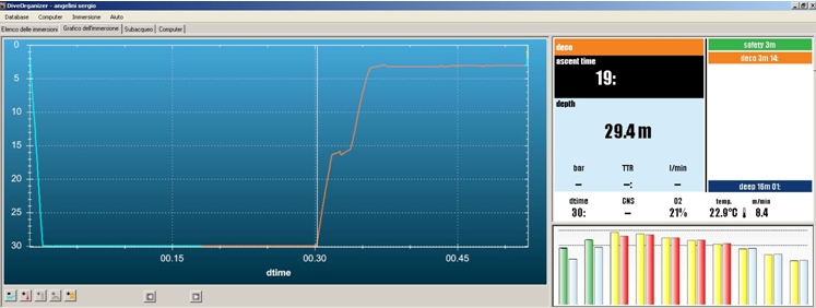 이러한 다이빙에서도 6m 수심의 강제 정지가 필요합니다. 그림에서 보듯이 수평선(130선) 위로 우측의 바들이 올라가 있습니다.