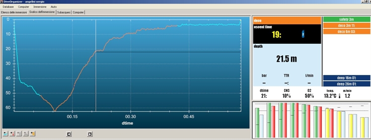 각 조직 내 압력 혹은 장력의 변화는 “다이브 오가나이저”의 해당 스크린에 표시됩니다. 10개의 조직은 좌에서 우로 반기의 증가에 따라 가로(수평) 축으로 표시됩니다.