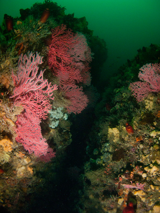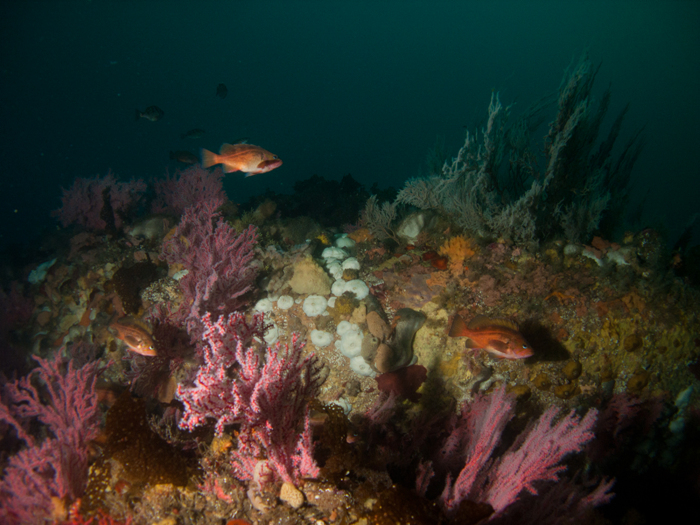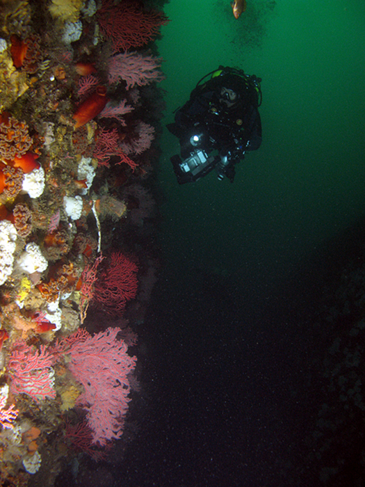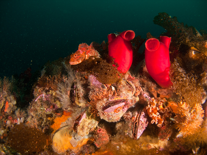다양한 종의 해양생물을 볼 수 있는 것이 섭바위 포인트의 매력인데 수온이 올라가면 다른 포인트에서 볼 수 없는 개복치, 물개, 돌고래 떼도 가끔 목격되고, 심해 어종인 미터 급 대구를 심심찮게 볼 수 있습니다. 섭바위의 암반은 섭과 비단멍게로 뒤덮여 있으며 섬유세닐말미잘, 부채뿔산호 등의 고착생물이 빼곡히 서식하고 있습니다.