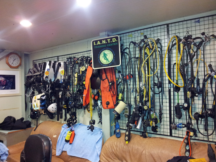 백플레이트와 하네스, 레큘레이터 셋트 등의 테크니컬 장비들이 비치되어 있는 장비실