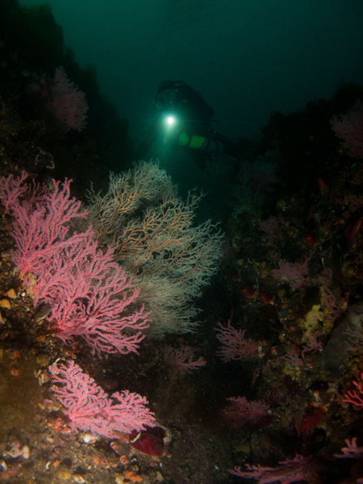 섭바위의 산호계곡을 탐사하는 테크니컬 다이버