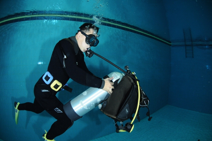 그 다이버는 바로 탱크가 빠진 다이버의 뒤로 돌아가 탱크를 위로 밀어 올리고 버클을 다시 채운 다음 버디에게 OK 사인을 보내었다.