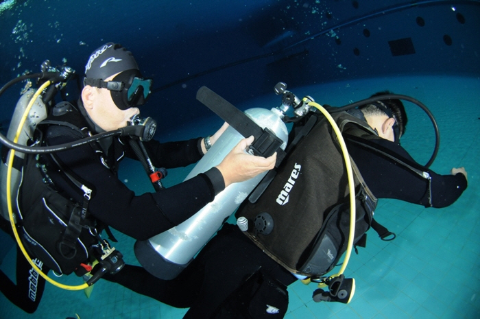 도움을 주는 다이버는 탱크가 빠진 다이버의 뒤로 이동하여 탱크 위에 자리를 잡아야 하는데, 이때 두 사람 모두 중성부력을 유지하고 있어야 한다.