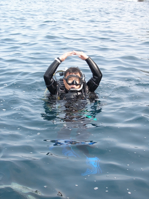 (사진 2)한쪽 주먹을 위로 뻗으면 OK신호이지만 종료지점이나 보트까지 자력으로 갈 수 없는 상황을 뜻한다.