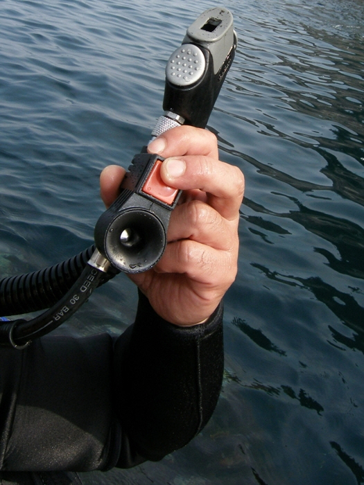 (사진 3) 다이브 얼럿 신호 장치는 탱크의 공기를 이용하여 주의를 뜻하는 경적음을 낸다.