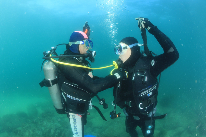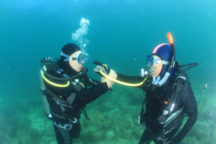2. 공급 받는 자는 한 손으로 옥토퍼스를 꼭 잡고 서로 떨어지지 않도록 BC의 어깨끈을 꼭 잡는다.