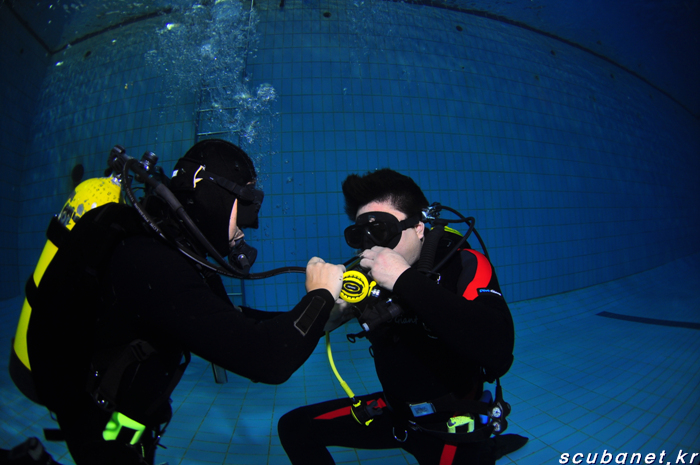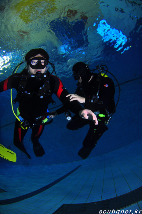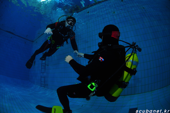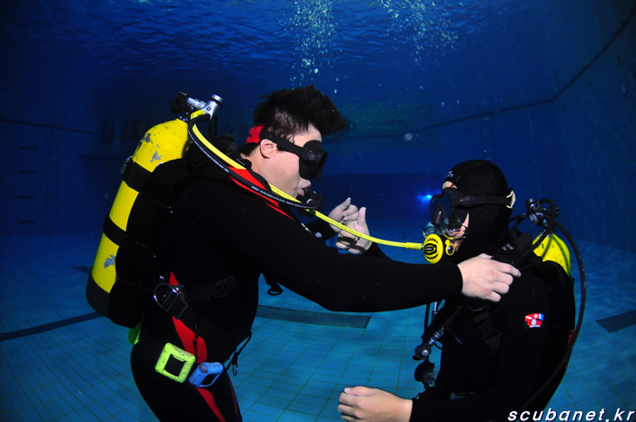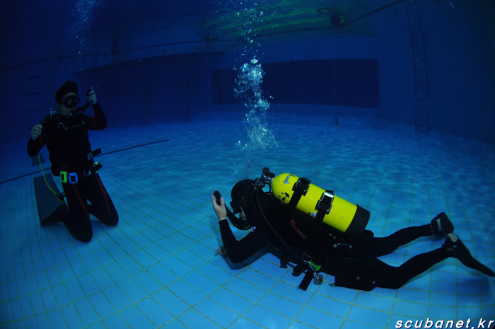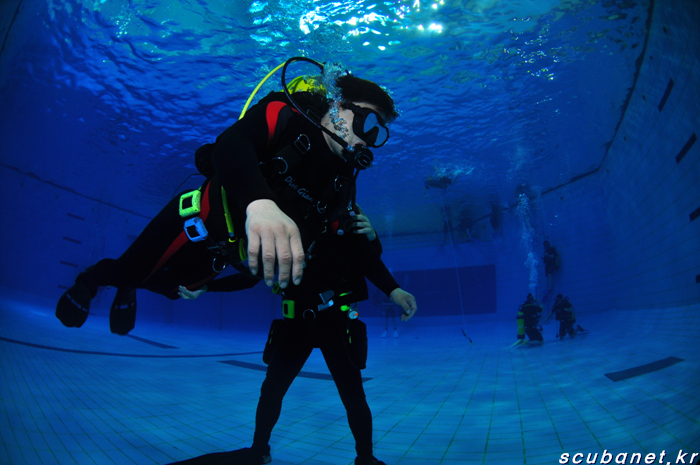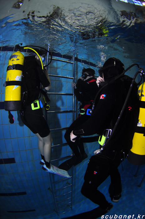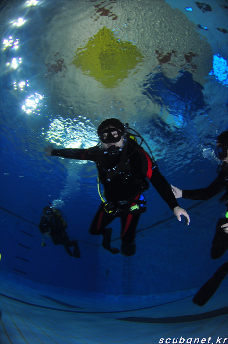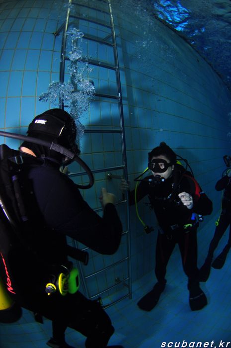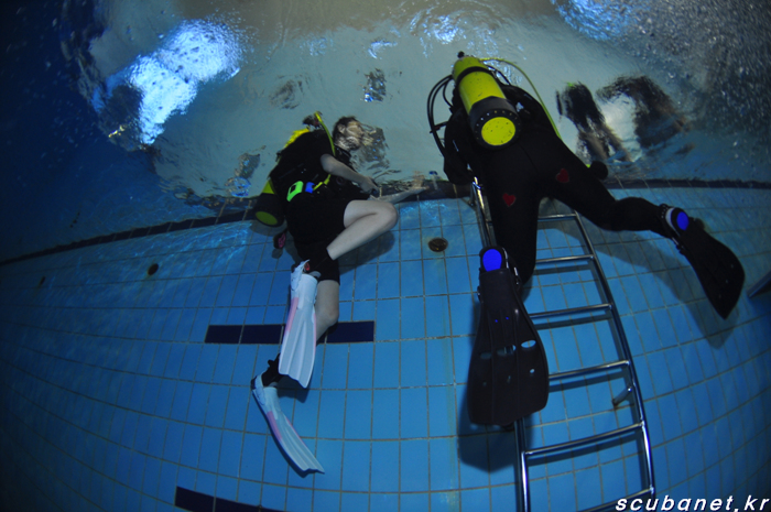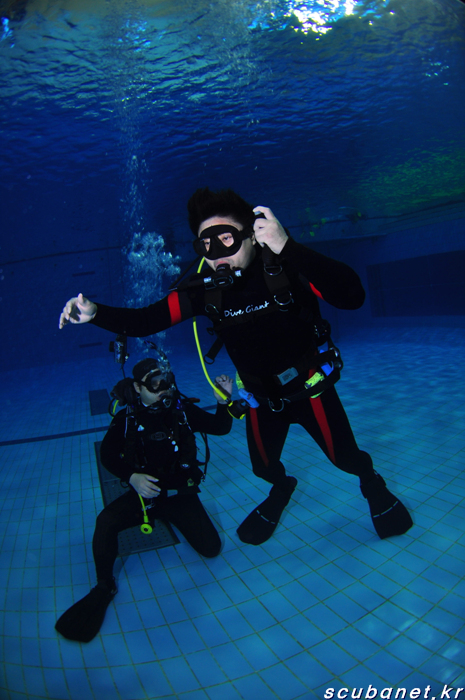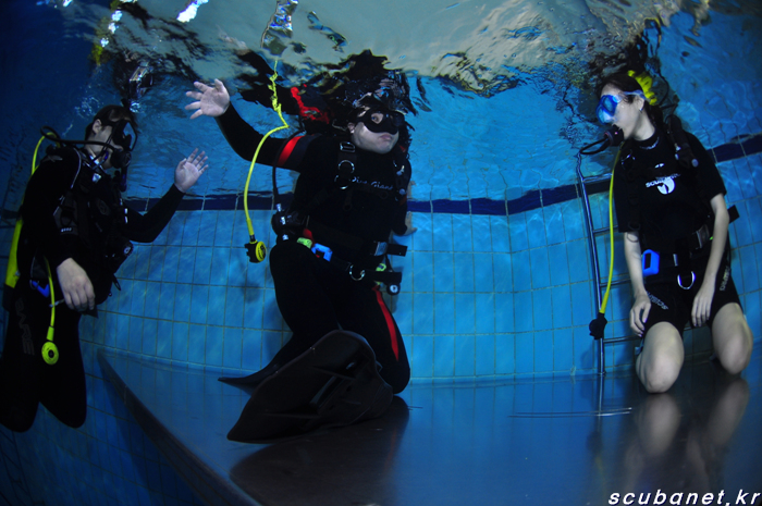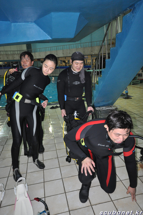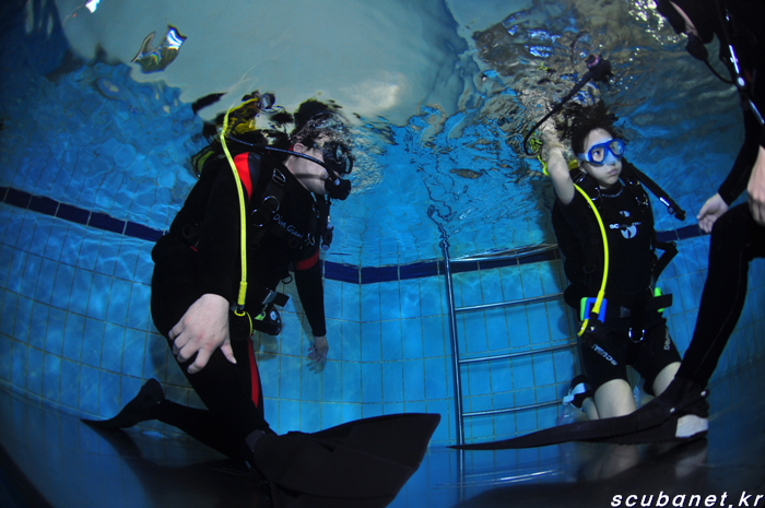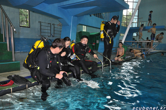 양준혁 씨는 야구선수 출신이지만 실제 수영도 못하며, 물을 무서워하는 사람이고, 김효진 양은 해외에서 체험 다이빙을 한번 경험해 보았다고 합니다. 그야말로 완전 초보인 이 두사람이 처음으로 수영장에 모였습니다. 사진으로 이들의 교육과정을 살펴보기로 합시다. ^^