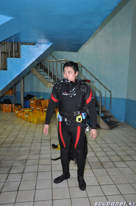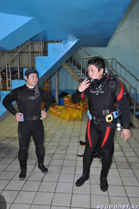 스쿠버 장비에 대한 설명을 받고 있습니다.