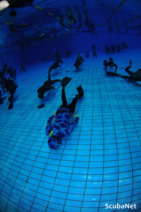 다이나믹 핀 방식이라고도 하는데 수심 1m 내외의 수영장에서 진행되는 프리다이빙 거리 기록경기로 핀을 사용한다.